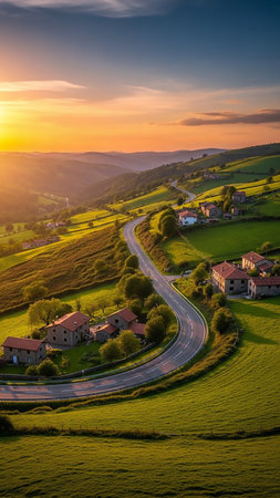 A peaceful rural landscape at sunset, with a winding road and scattered houses nestled amongst rolling green hills bathed in golden light.