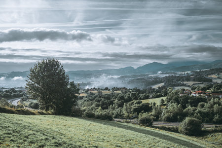 Morning panorama of Asturias countryside along the Camino Primitivo/Camino de Santiago, with misty hills, winding road, lone tree and layered mountains under dramatic cloud sky