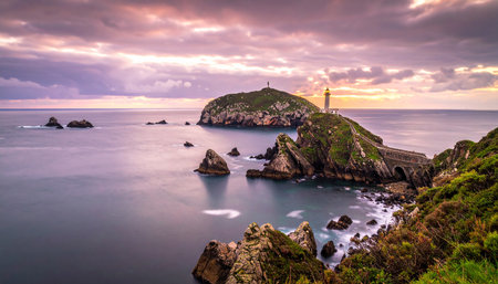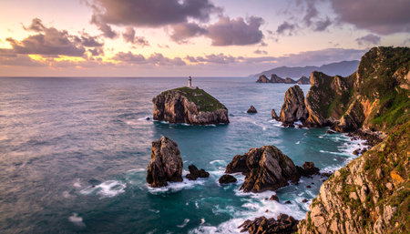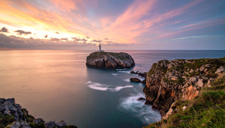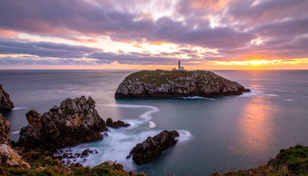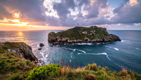 Lighthouse on an island with dramatic cliffs and a vibrant sunset over the ocean. Clear details and vibrant colors en...