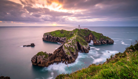 Lighthouse on a green island with rocky formations and swirling ocean waves during a dramatic sunset.