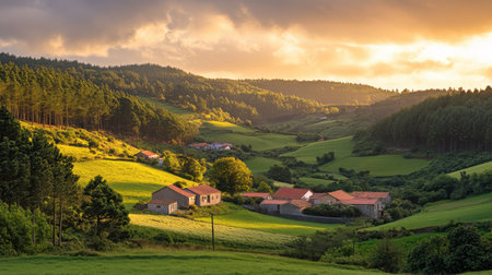 As the sun sets over Serra do Xistral, golden light bathes the rolling hills and vibrant forests of Galicia, creating a peaceful and tranquil rural landscape.