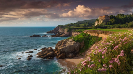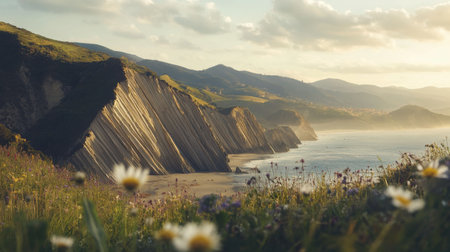 The Flysch cliffs along the Zumaia coastline create a surreal landscape, with their distinctive rock formations tilted towards the sea, basking in soft afternoon light among wildflowers.