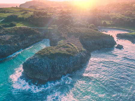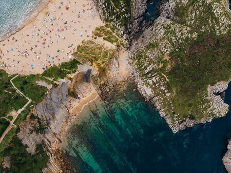 Aerial view of reefs and cliffs after dawn on Arnia Beach. Northern Spain in summer