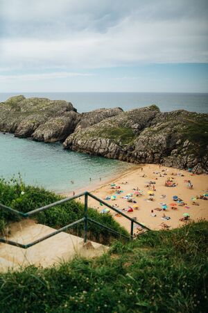 Beautiful spanish beach with turquoise water and rocky cliffs in northern spain