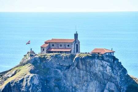 Landscape with a small village, hill, forest, sea and blue sky with clouds. Basque Country, Spain. Camino de Santiago