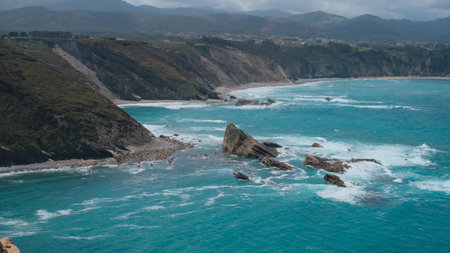 A scenic aerial or high-angle shot of a rugged coastline with turquoise blue waters crashing against rocky shores and cliffs. Asturias, Spain