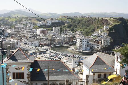 Picturesque coastal town in Northern Spain, featuring traditional houses with red roofs perched atop dramatic cliffs overlooking a turquoise bay. Llane,s, Asturias