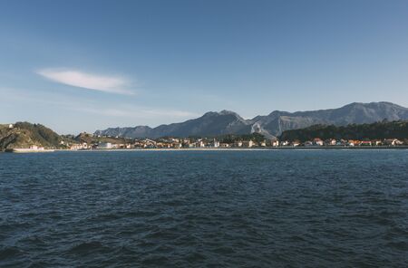 Landscape with a small village, hill, forest, sea and blue sky with clouds. Basque Country, Spain. Camino de Santiago