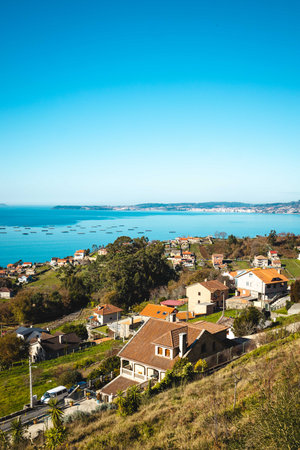 Coastal town with red-roofed houses and a sandy beach. A scenic view of a coastal town featuring houses with red roofs, sandy beach and a serene bay surrounded by greenery. Santander, Cantabria, Spain