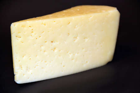 piece of hard cheese on a black background. Fresh cheese on a dark background. Food ingredient. Appetizing cheese isolated on black background close-up