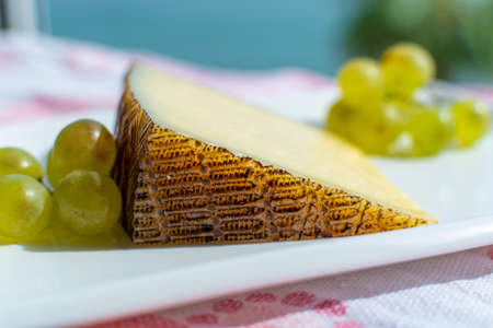 Piece of Spanish hard scheep milk cheese Manchego served with black grapes close up