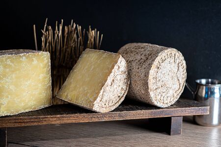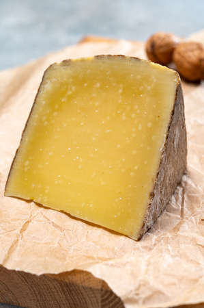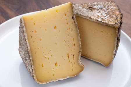 Cheese collection, hard French cheese old cantal fermier made from raw cow milk with rind close up