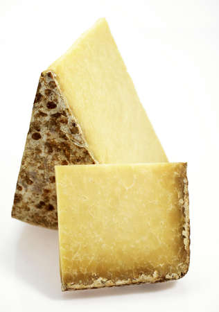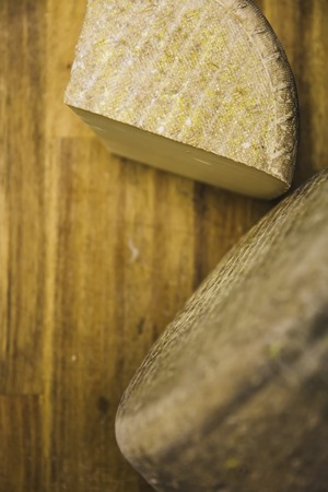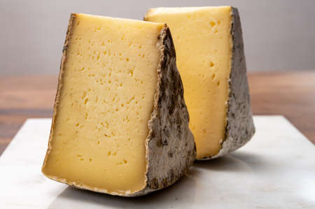 Two pieces of french hard cow or goat cheese Tomme or Tome, produced in French Alps