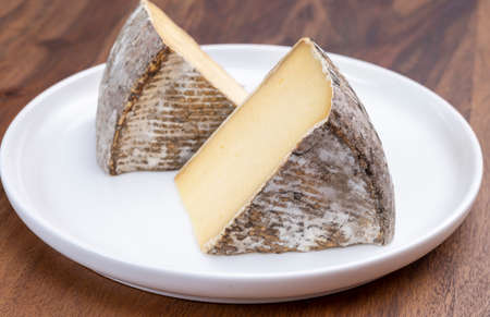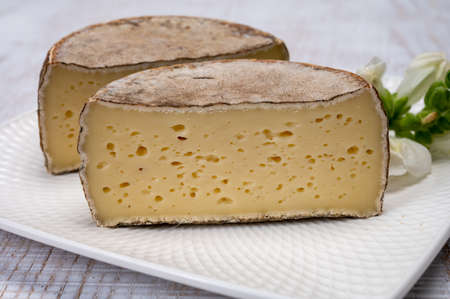 Tasting of ancient french demi soft cheese Tomme from French Alps, made from cow, goat or sheep skim milk, low fat french cheese close up
