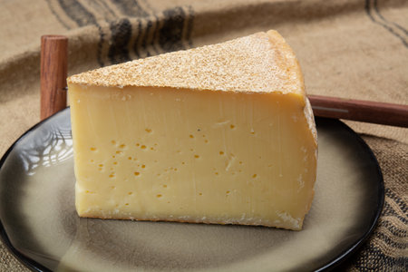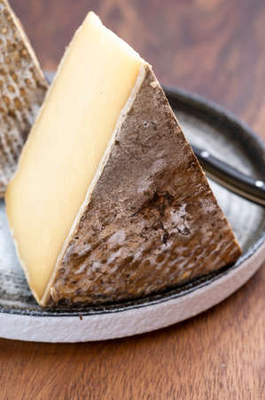 Cheese collection, Tomme de Savoie cheese from Savoy region in French Alps, mild cow's milk cheese with beige interior and thick brownish-gray rind close up