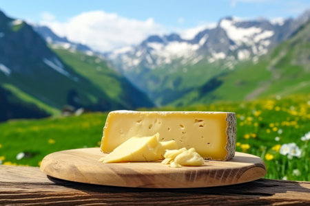 Perfect combination, natural fresh cheese and inspiring alpine landscape, close-up