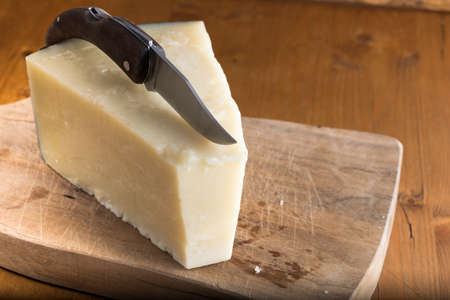 Medium hard cheese head parmesan on wooden board, with cheese parmesan knifes.