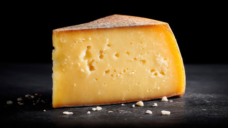 This stunning image showcases a slice of aged cheese with visible salt crystals, highlighting its rich topaz color and distinctive texture against a dark background.