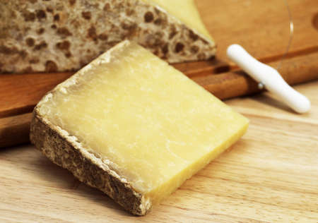 Small block of aged cheese on wood board with knife