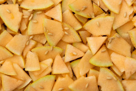 Slices of fresh cantaloupe melon arranged in a pattern, close up. Summertime fruit concept