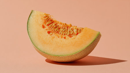 A vibrant cut cantaloupe sits against a clean pastel background, showing its juicy orange flesh and inviting texture with seeds visibly nestled inside.