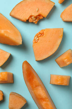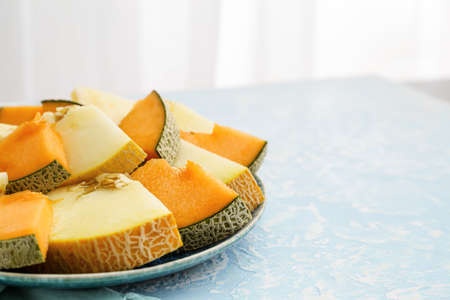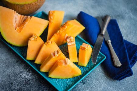 Close up of fresh melon sliced on table, raw ripe biological fruit, food background