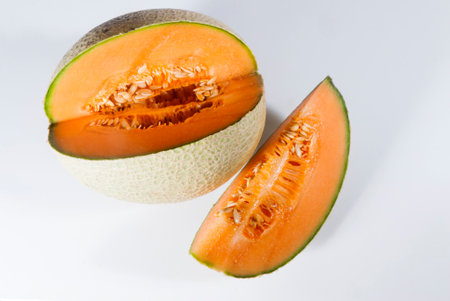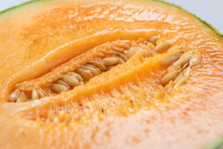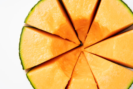 slice of japanese melons, orange melon or cantaloupe melon on white wood background, summer fruits