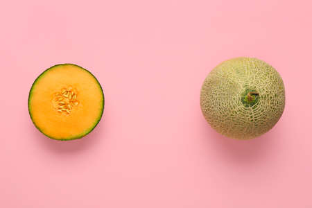 Exotic cantaloupe melon and slices on marigold coloured backdrop. Ripe tropical fruit background. Idea of spring summer season colour trend. Food photography. Flat lay, copy space.