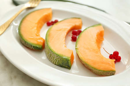 Close-up of ripe and juicy melon slices served on a ceramic plate.