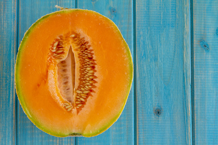 Open half of cantaloupe melon sitting on bright blue wooden table