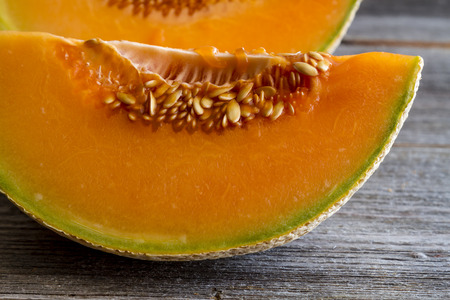 Close up of two cantaloupe melon quarters with seeds in row sitting on rustic wooden table top