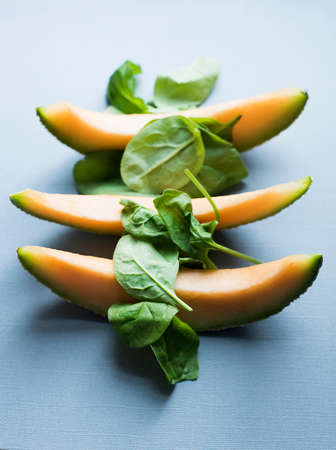 Three slices of fresh melon and spinach