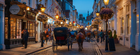 A Victorian-era street with gas lamps and horse-drawn carriages.