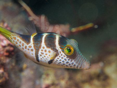 The spotted sharpnose puffer, Canthigaster solandri lives in the Indo Pacific: