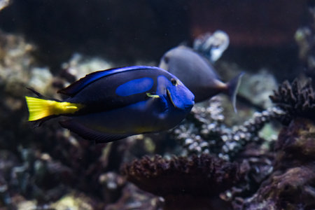 closeup of a colorful tropical fish swimming in a coral reef aquarium