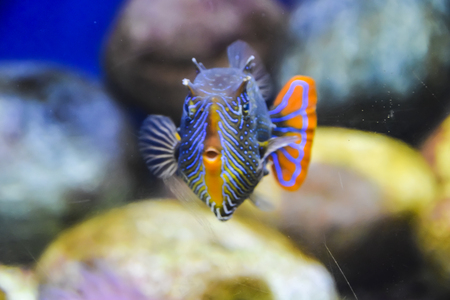 exotic fish dark blue striped with an orange tail under water in aquarium