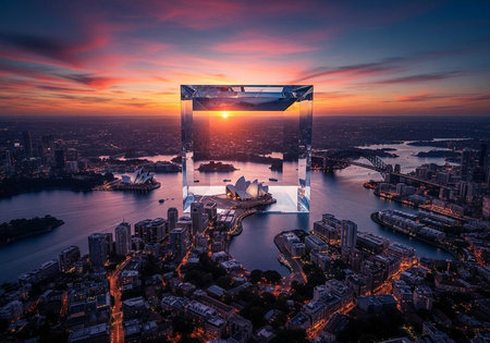 Aerial view of a city at sunset with a reflective glass building in the center, surrounded by water and urban landscape.