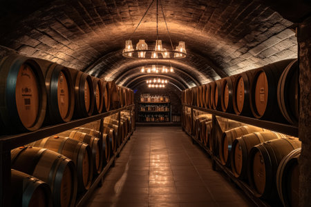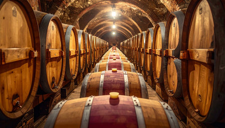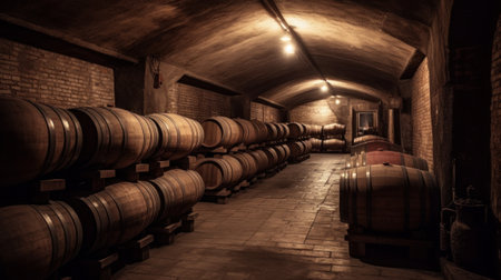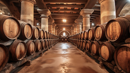 Aged Wine Barrels in Historic Stone Cellar with Illuminated Corridors
