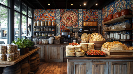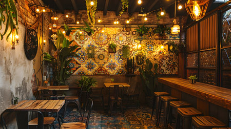 This image showcases a warm and inviting restaurant interior with a distinct bohemian and eclectic style. The space features a mix of rustic and global design elements, including vibrant patterned