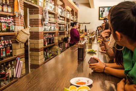 Oaxaca, Oaxaca / Mexico - 21/7/2018: Detail of some tourists tasting mezcal in store in Oaxaca Mexico