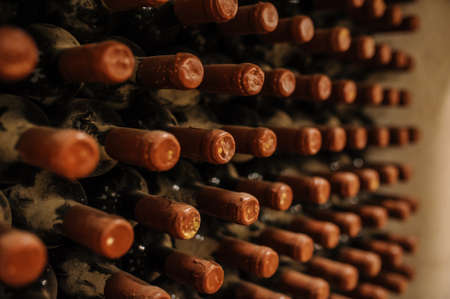 HONFLEUR, FRANCE, AUGUST 27, 2012: Bottles on the shelf in a private wine cellar.