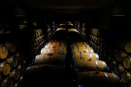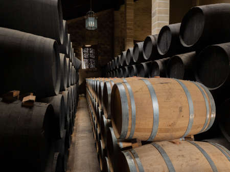 Old french oak wooden barrels in underground cellars for wine aging process, Vintage Barrels and Casks in Old Cellar: A Spanish Winerys Perfect Storage for Aging Delicious Wine. High quality photo