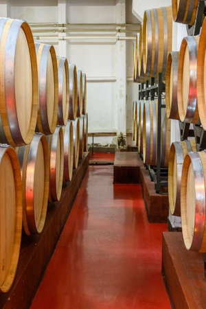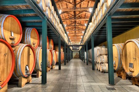 Traditional wine cellar interior with stacked old wooden barrels. Concept of touristic wine route and winemaking business.