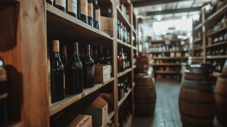 Defocused wine bottles on wooden shelves in a cozy liquor store, offering the perfect backdrop for beverage-themed visuals.