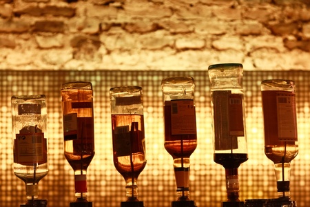 Many glass wine bottles on shelves interior in restaurant. Blurred background