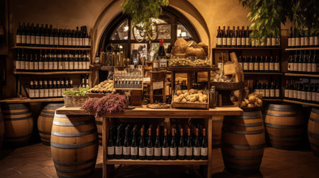 Elegant Vintage Wine Cellar Displaying Dark Wooden Barrels and Bottles on Shelves Under Dim Lighting