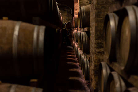 Vintage old oak barrels of wine, cognac in the wine dark vaults of the winery. Selective soft focus. Shooting in the dark