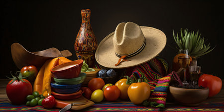 Cinco de Mayo: Mexican food on wooden table with sombrero hat and wine