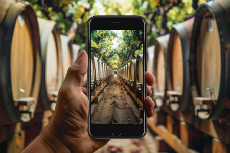 Smartphone displaying image of beautiful vineyard landscape in vivid detail held by anonymous person