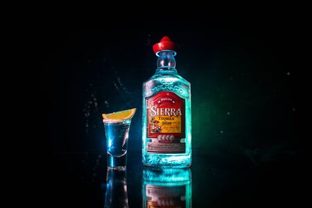 Baku, Azerbaijan - JUNE 16. 2019. Bottle of Sierra Tequila, a brand of liquor belonging to the company Borco-Marken-Import from Hamburg, manufactured in Destilerías Sierra Unidas, Guadalajara, Mexico